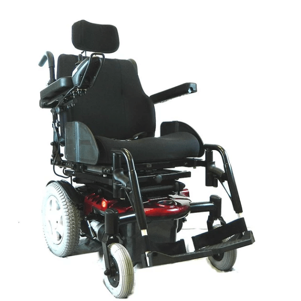 - This power wheelchair has a modern look with a solid-colored upholstered seat. It has a sleek, relaxed design that does not look intimidating..